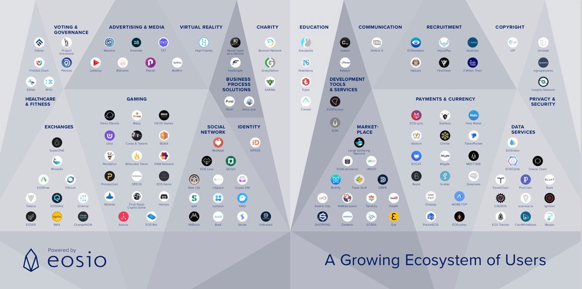 Der Fokus liegt, wie anfangs erwähnt, auf vielfältigen Applikationen für eine breite Masse an Nutzern. Bis heute gibt es bereits eine Vielzahl an Anwendungen, und das EOS Ökosystem ist neben Ethereum und Tron eines der aktivsten: