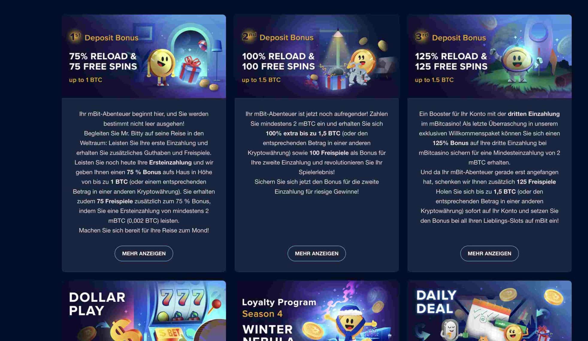 Neue Spieler können sich mit dem mBit Bonus auf ein umfangreiches Willkommenspaket freuen. Dieses greift für die ersten drei Einzahlungen auf das Spielerkonto und aktiviert bis zu 4 BTC und 300 Freispiele. Für alle drei Einzahlungsboni ist jeweils ein Einzahlungsbetrag von 2 mBTC erforderlich.